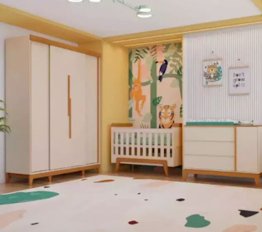 Modelo “Acaiu” | Cor off White| 1 armário quatro portas de correr|1 cômoda com três gavetas| 1 berço
