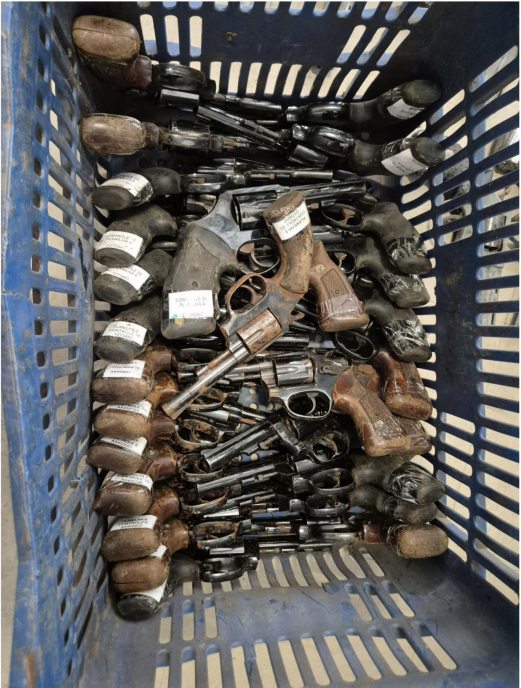 DESCRIÇÃO DOS BENS: Lote 07: Revólver calibre 38, PUCARA, 6 tiros: C21305, C21306, C21308, C21311, C21330, C21334, C21336, 21339, 21341, C21342, cada unidade avaliada em R$ 450,00.